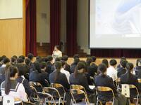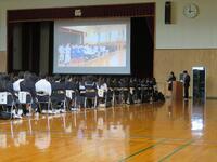 校長あいさつの後、本校教員から南高の特徴である単位制や入試制度の説明、各種語学留学や卒業後の進路の説明が行われ、最後に生徒会役員から学校行事や各部局の紹介がありました。