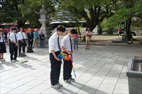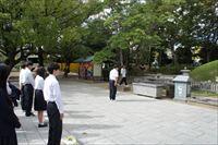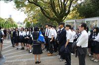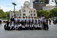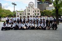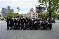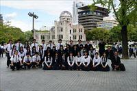 広島空港到着後、バスで広島市内へと移動し、原爆ドーム見学、原爆供養塔前で平和集会を行い、代表生徒による平和宣言、2年次生がみんなで折った折り鶴を奉納と献花を行いました。