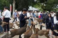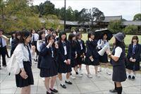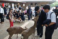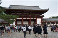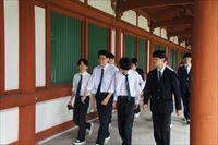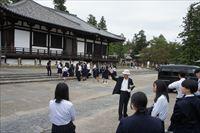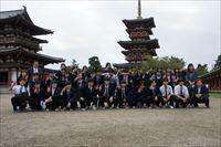 薬師寺到着後、少し雨が降ってきました。最初に旅行団全員で講話を聞き 、薬師寺の概要についてだけではなく、周りの笑顔が増えると自分も笑顔になることの大切さについても講話していただきました。生徒たちも講話を真剣にそして時に講話の話に笑いもあり、素敵な時間を過ごすことができました。その後、クラス写真撮影、薬師寺内を自由見学し、奈良公園へと向かいました。